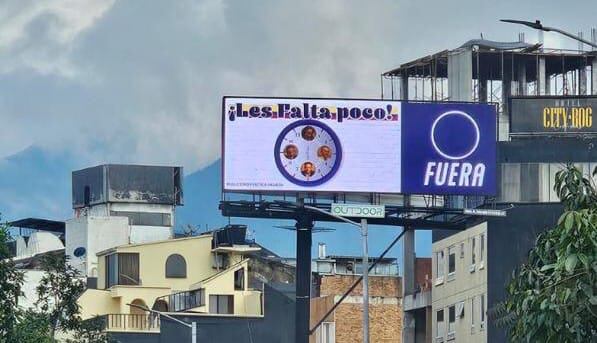 En Bogotá y Medellín aparecieron varias vallas gigantes con un mensaje que no pasa desapercibido: “¡Les falta poco!”. FUERA.
