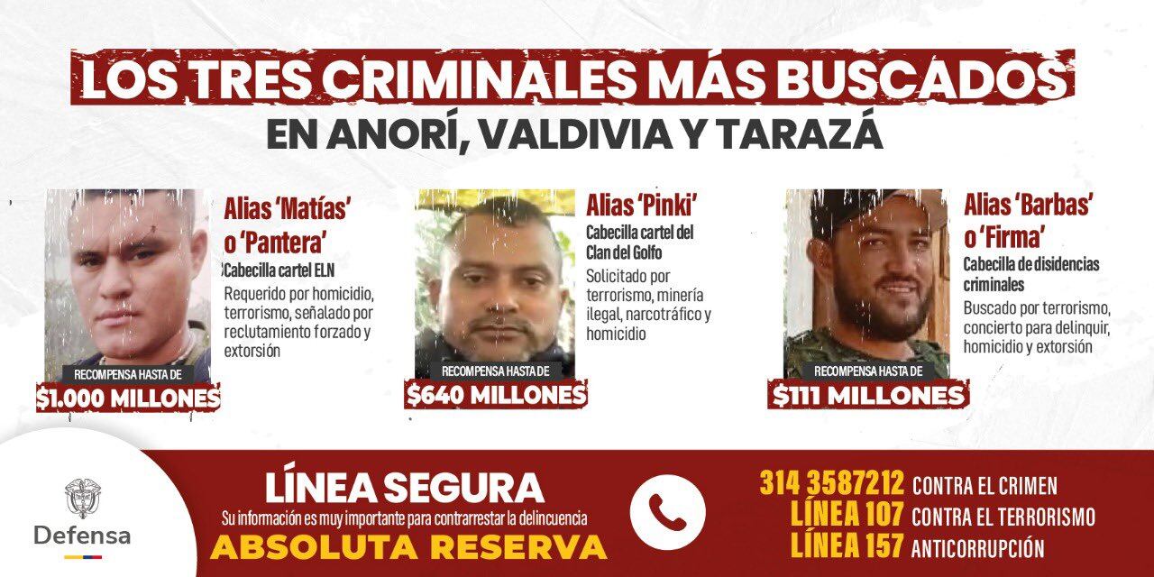El ministro de Defensa, el General retirado Pedro Sánchez, publicó las imágenes de los tres delincuentes más buscados en los municipios de Anorí, Valdivia y Tarazá, señalados de liderar estructuras criminales responsables de homicidios, desplazamientos, extorsiones y reclutamiento de menores en el norte y Bajo Cauca antioqueño.