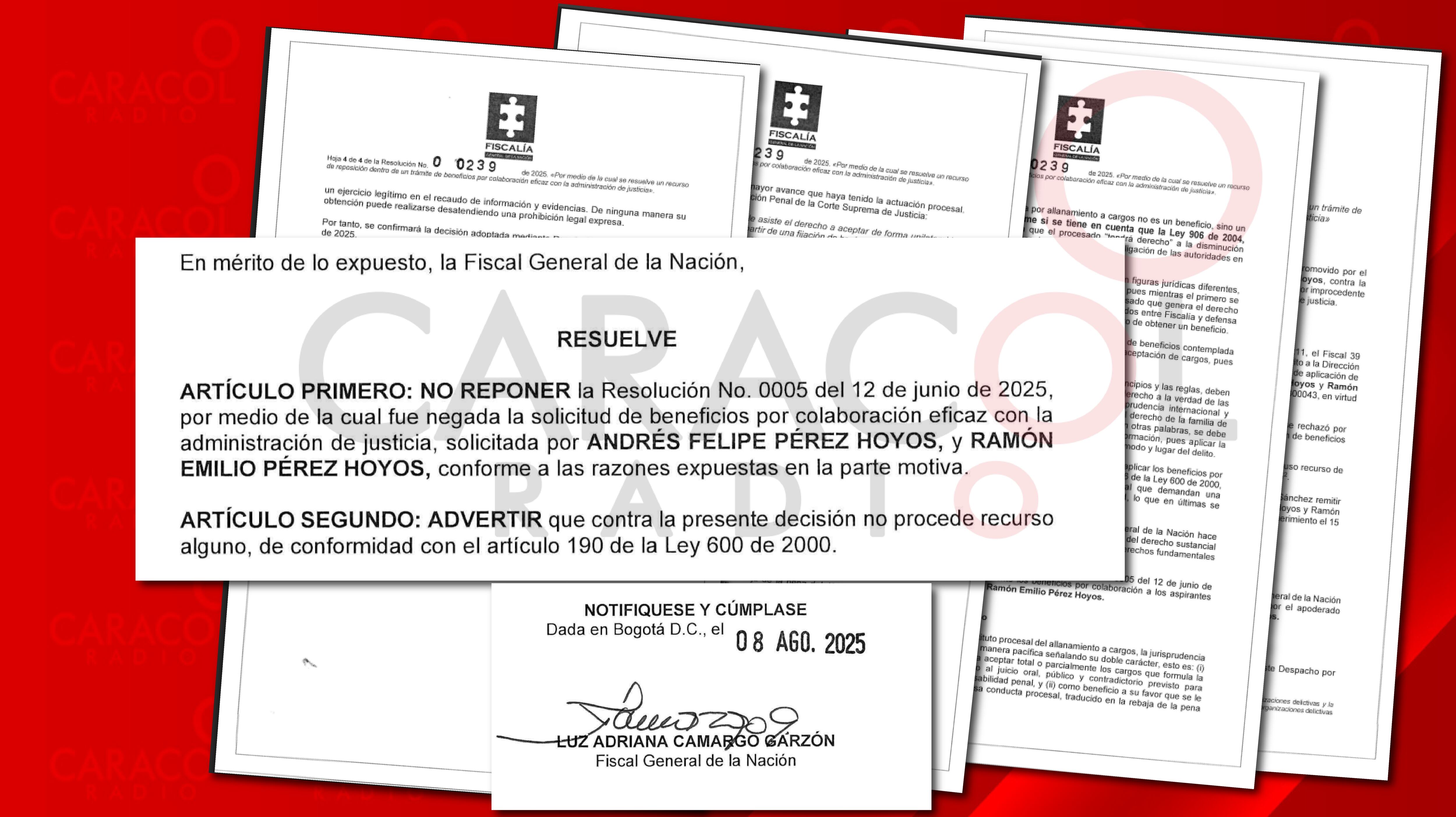 Con una resolución de cuatro páginas la fiscal General Luz Adriana Camargo ratificó que no habrá beneficios judiciales a los “narco” hermanos Andrés Felipe y Ramón Emilio Pérez Hoyos, condenados a 25 años de cárcel por haber confesado que ellos fueron los encargados de entregarle al hoy asesinado testigo Francisco Luis Correa $1.500 millones para que planeara y ejecutara el homicidio del fiscal paraguayo Marcelo Pecci, en mayo de 2022.