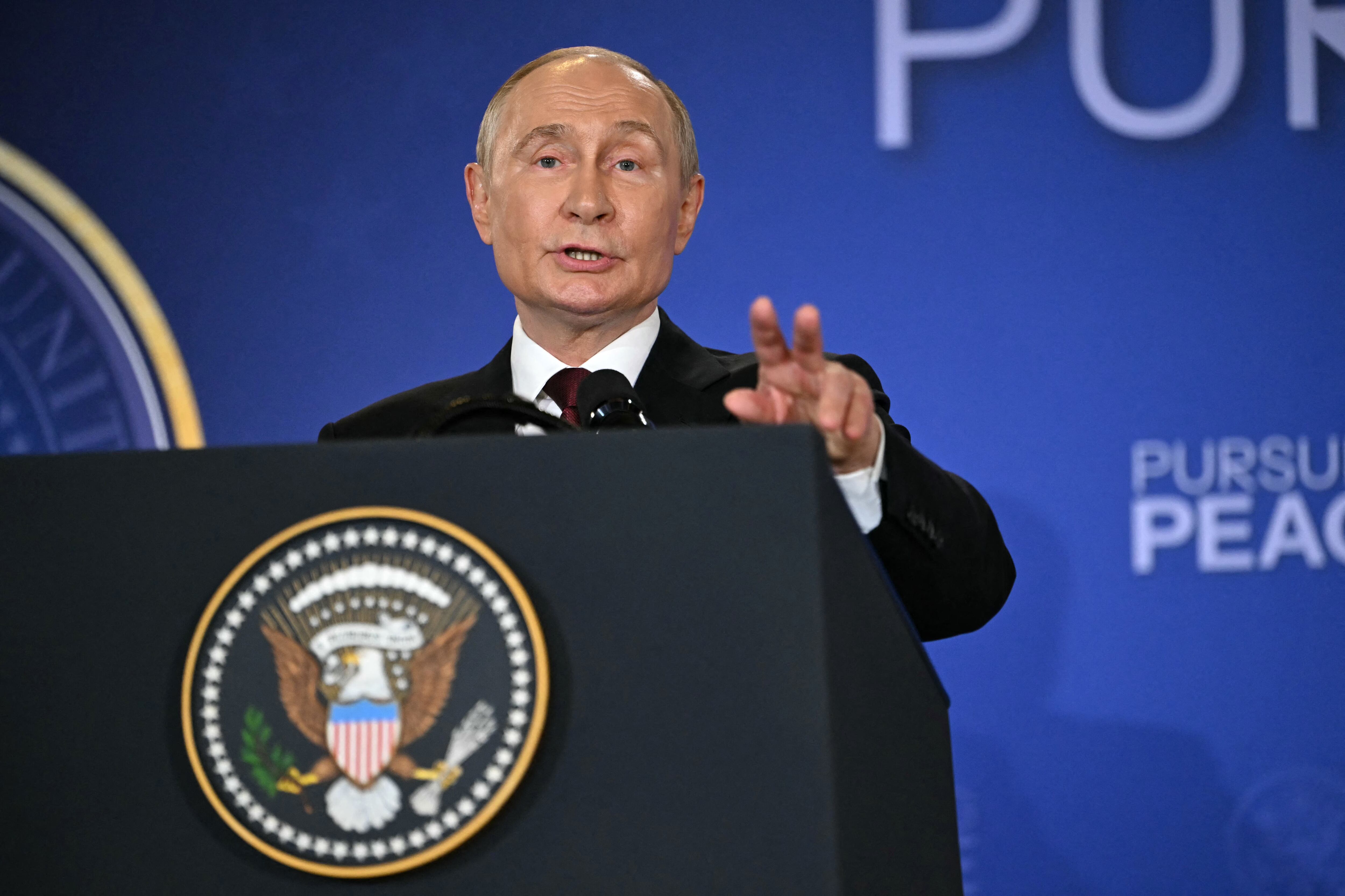 El presidente ruso, Vladímir Putin, habla durante una rueda de prensa conjunta con el presidente estadounidense, Donald Trump (fuera de cuadro), tras participar en una cumbre ruso-estadounidense sobre Ucrania en la Base Conjunta Elmendorf-Richardson en Anchorage, Alaska, el 15 de agosto de 2025. (Foto de ANDREW CABALLERO-REYNOLDS/AFP vía Getty Images) / ANDREW CABALLERO-REYNOLDS