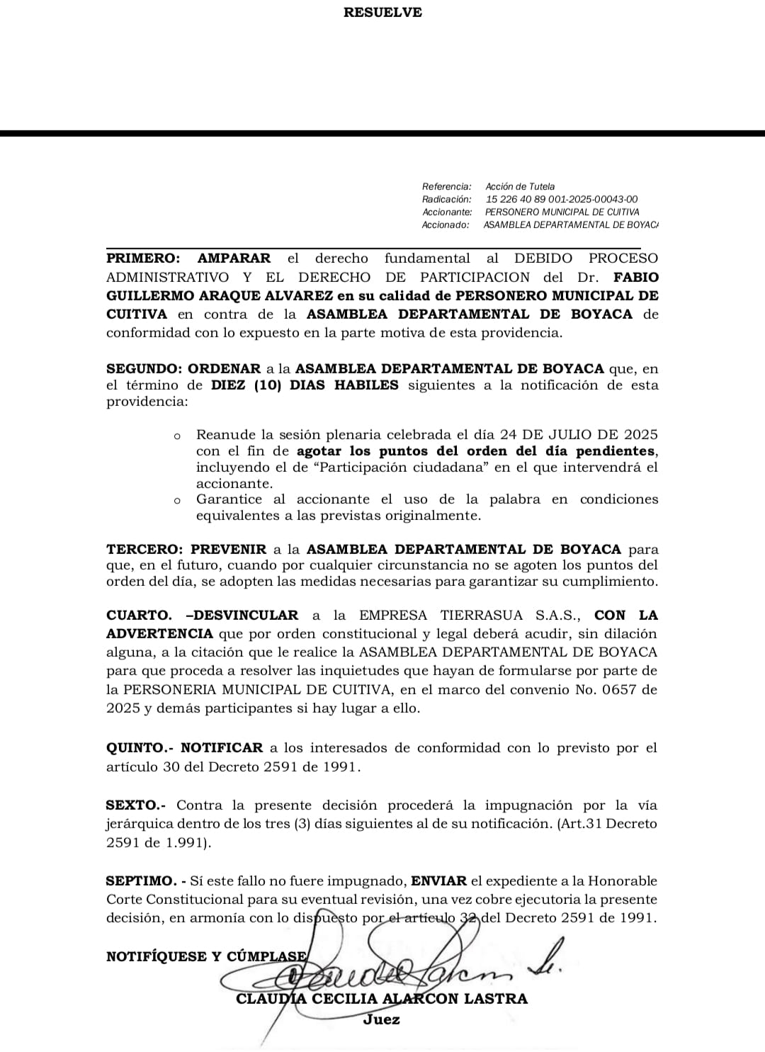 Ante esto, el Juzgado Promiscuo del municipio de Cuítiva falló la Acción de Tutela a favor del personero Fabio Guillermo Araque Álvarez y le ordenó a la Asamblea de Boyacá, que en el término de 10 días hábiles “reanude la sesión plenaria celebrada el día 24 de julio de 2025 con el fin de agotar los puntos del orden del día pendientes, incluyendo el de “Participación ciudadana” en el que intervendrá el accionante”, además se le debe “garantizar al accionante el uso de la palabra en condiciones equivalentes a las previstas originalmente”.