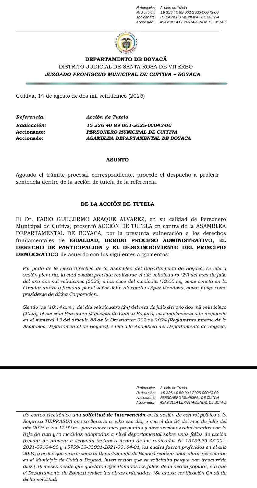 El Juzgado Promiscuo de Cuítiva falló a favor del personero municipal, Fabio Guillermo Araque, una acción de tutela que interpuso contra la Asamblea de Boyacá y le ordena a la Corporación adelantar de nuevo la sesión plenaria del 24 de julio de 2025.