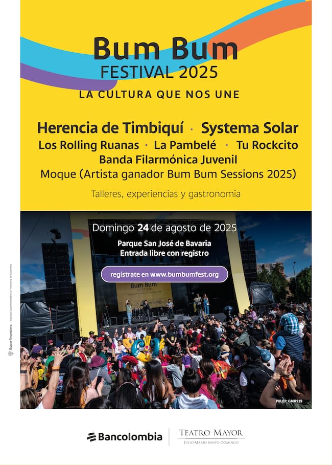 El próximo 24 de agosto regresa a Bogotá el Bum Bum Festival en su cuarta edición, una iniciativa de Bancolombia y el Teatro Mayor Julio Mario Santo Domingo dirigida a las familias colombianas, donde el arte, el entretenimiento, la gastronomía y la diversidad musical de todas las regiones del país converge en un solo lugar. El evento se realizará en el Parque San José de Bavaria. Para adquirir las entradas gratuitas, para todas las edades, las personas deberán registrarse a través de www.bumbumfest.org.