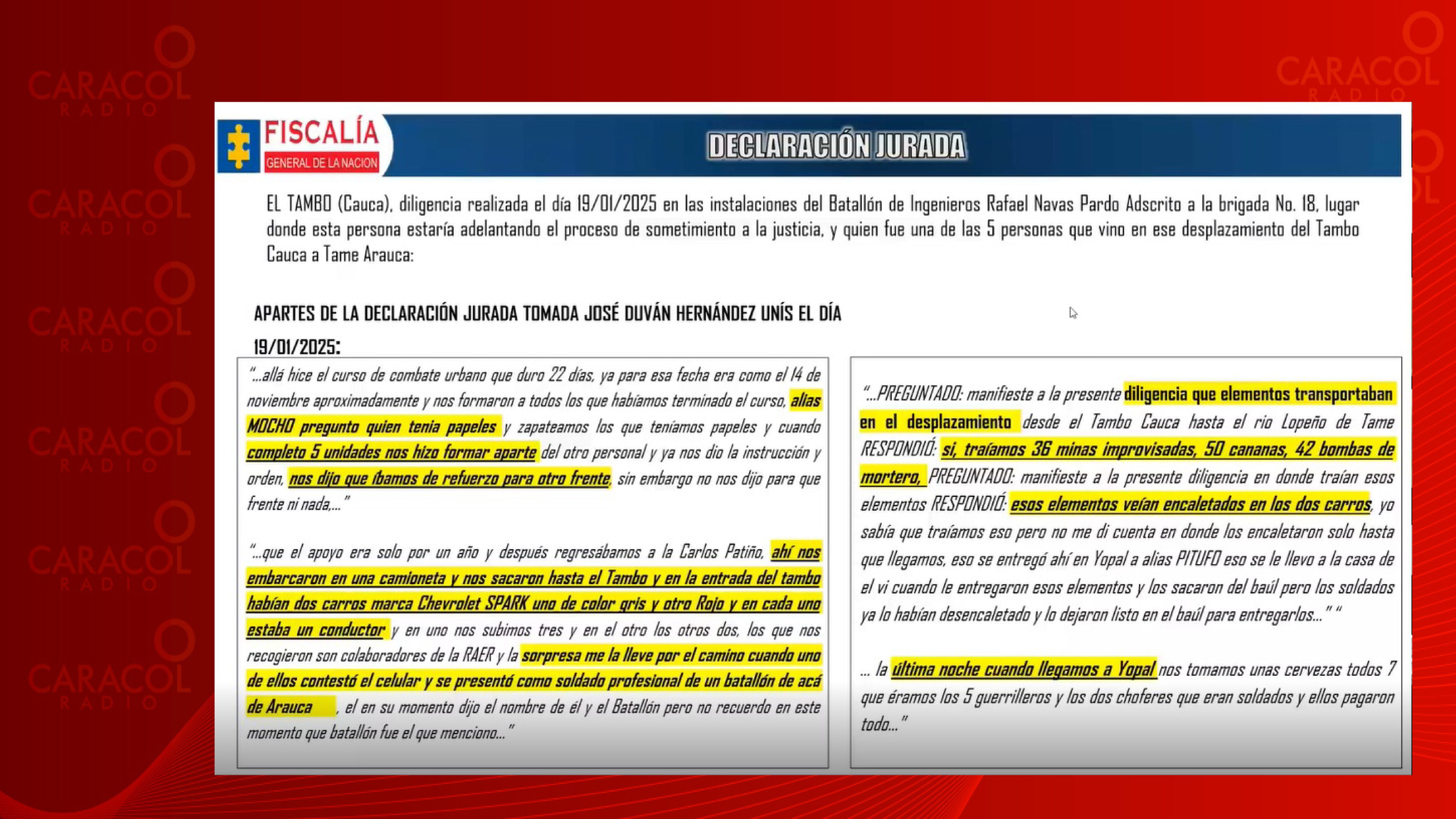 Uno de los guerrilleros que fue transportado desde el Cauca hasta Arauca se sometió a la justicia en enero de 2025 y rindió una declaración jurada en la fiscalía. Se trata de José Duván Hernández, quien aseguró que hubo presencia de integrantes del Ejército Nacional en la logística criminal.