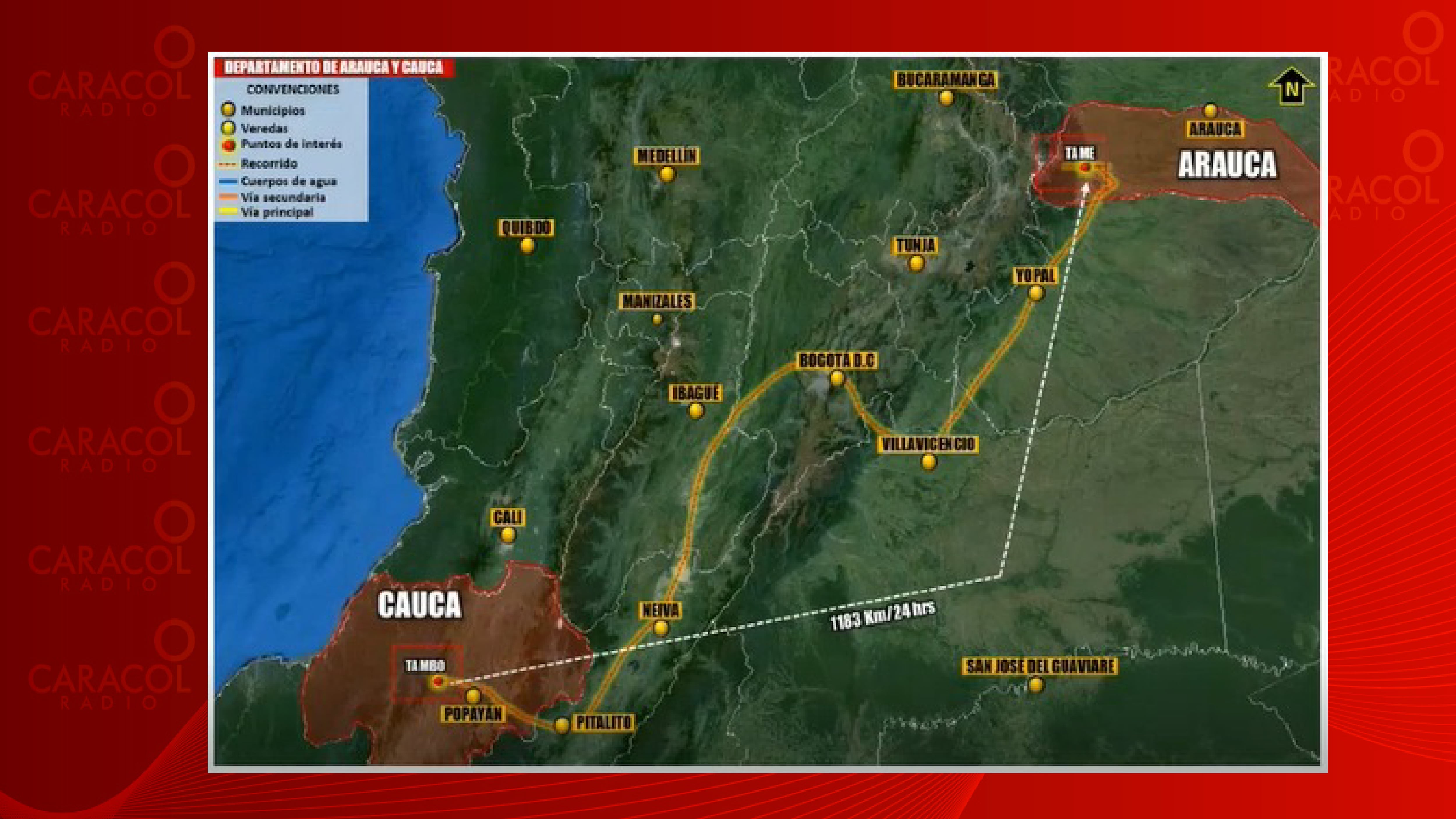 La Fiscalía asegura que los jóvenes milicianos atravesaron el país desde el municipio de El Tambo, Cauca, hasta la zona rural de Tame, en el departamento de Arauca. En total fueron 1.183 kilómetros recorridos en vehículos particulares, que burlaron los puestos de control de las autoridades instalados en las carreteras.