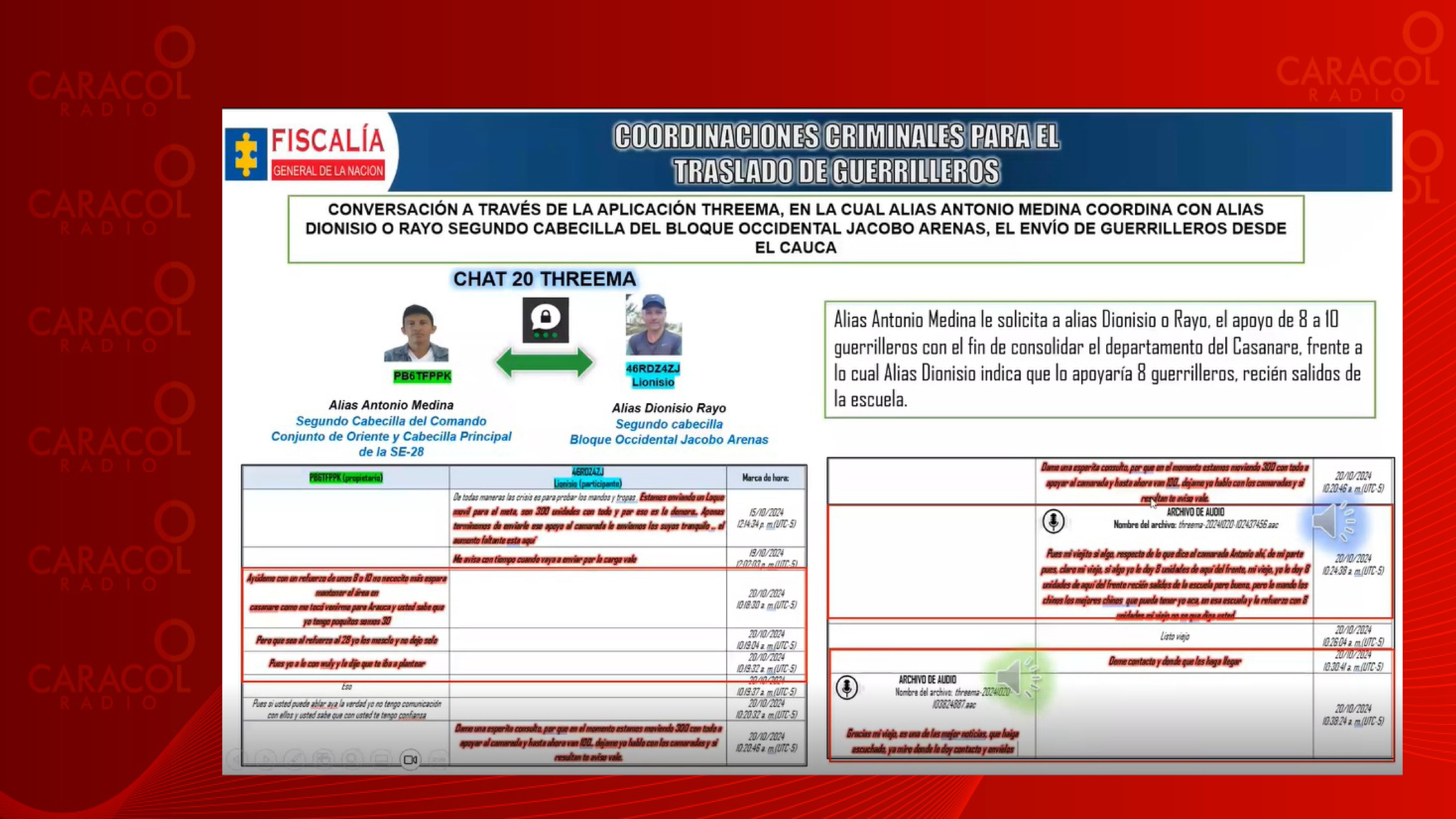 En la conversación que pudo obtener la Fiscalía, y que hoy revela la Unidad Investigativa de Caracol Radio, Medina solicita el envío de milicianos para fortalecer la presencia criminal en el oriente del país.