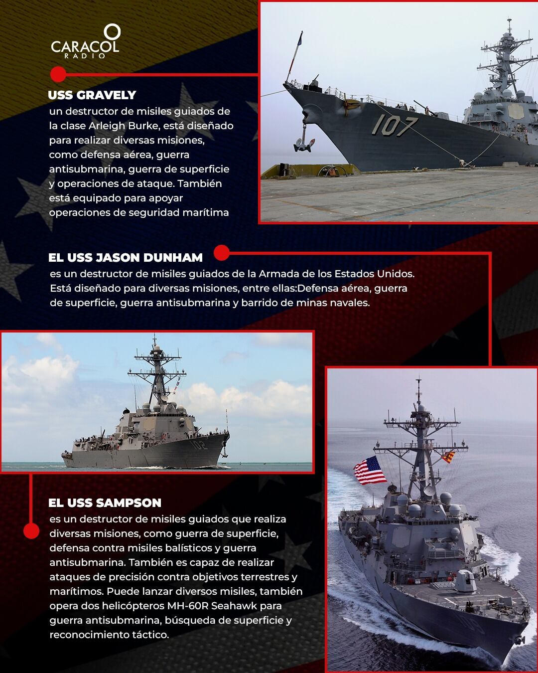 Tres destructores estadounidenses con misiles guiados Aegis llegarán a las costas de Venezuela en las próximas 24 horas como parte de un esfuerzo para abordar las amenazas de los cárteles de la droga latinoamericanos, según reportó Reuters. Los barcos desplegados son el USS Gravely, el USS Jason Dunham y el USS Sampson.
