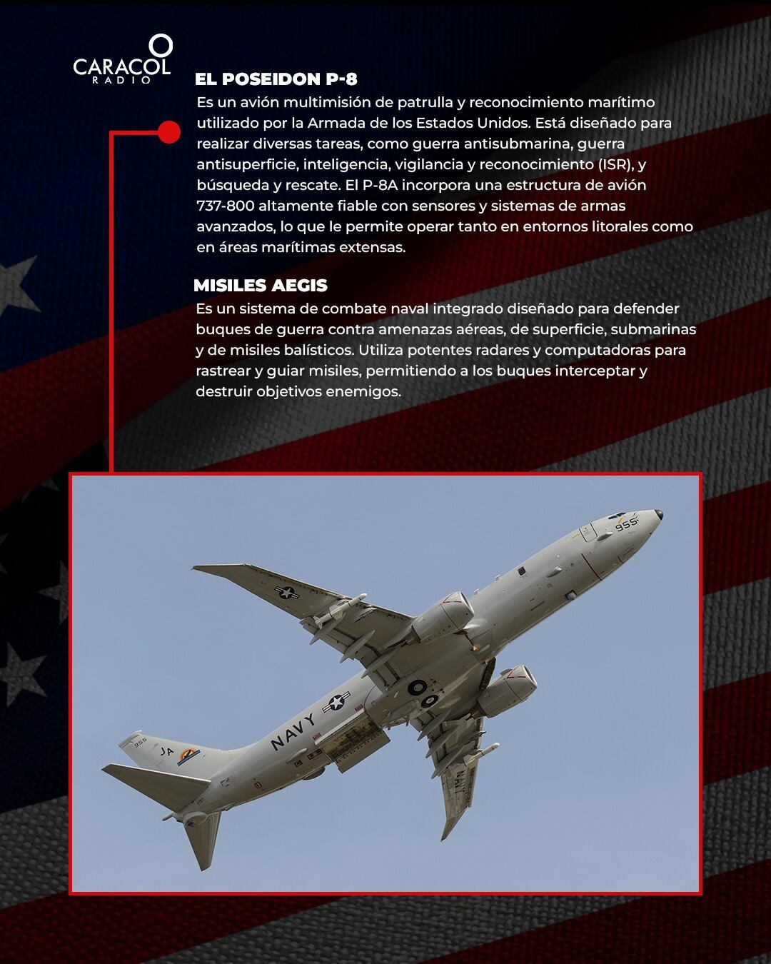 Un submarino de ataque de propulsión nuclear, un avión de reconocimiento P8 Poseidon adicional, varios destructores y un crucero con misiles guiados también serán asignados al Comando Sur de Estados Unidos como parte de la misión.