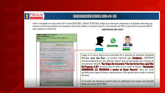 La Fiscalía encontró varios chats que demostrarían que el teniente Tangua exigía a las disidencias FARC los pagos por la entrega del material bélico e información privilegiada. Para evitar cualquier sospecha, le pedía a alias ‘Ruso’ que girara los dineros a la cuenta bancaria de Néstor Orlando Ricaurte.
