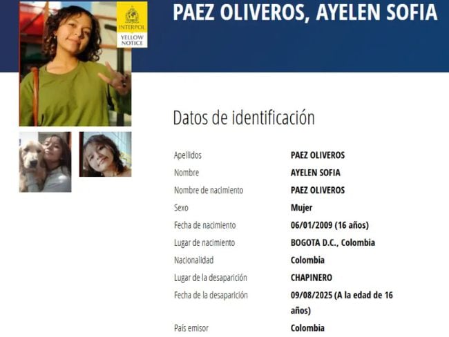 La desaparición de la niña de 16 años Ayelen Sofía Páez Oliveros desde el pasado 9 de agosto en Bogotá, prendió las alarmas de las autoridades internacionales. La Interpol emitió una circular amarilla para ayudar en la búsqueda de la menor.