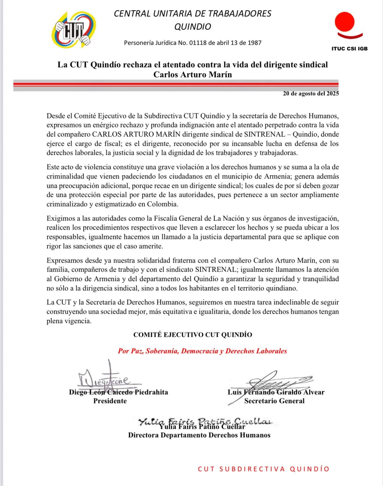 Comunicado CUT sobre atentado contra líder sindical en Armenia