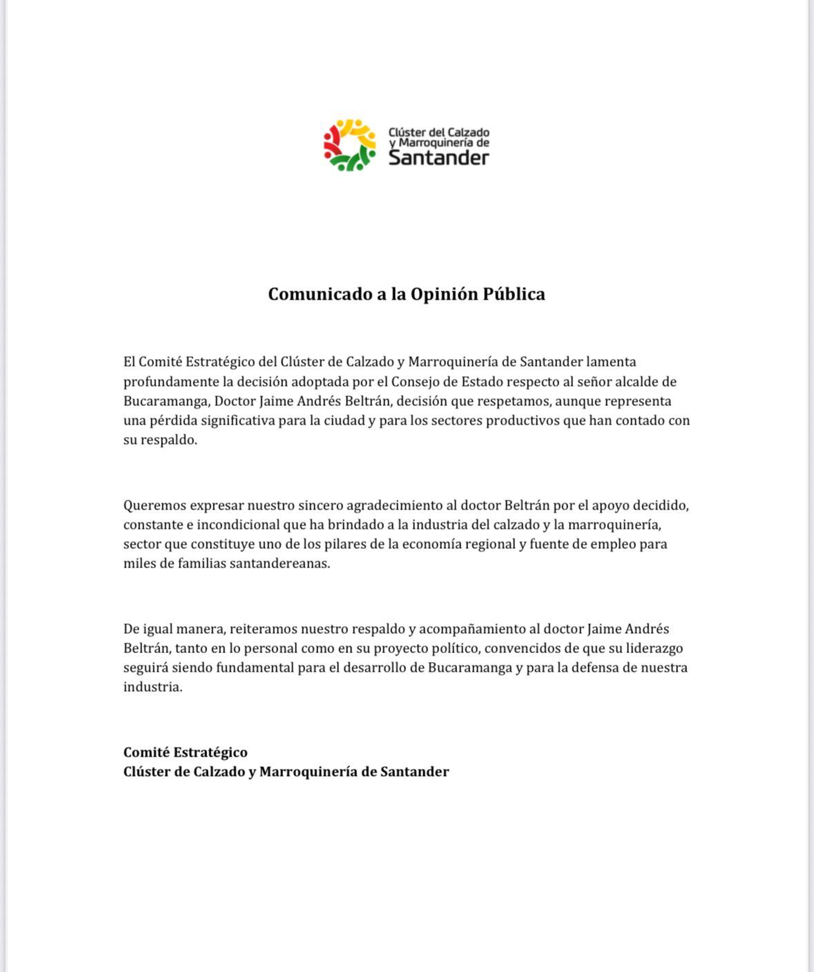 Por otra parte, el Comité Estratégico del Clúster de Calzado y Marroquinería de Santander lamentó la decisión adoptada por el Consejo de Estado respecto al futuro del alcalde de Bucaramanga.