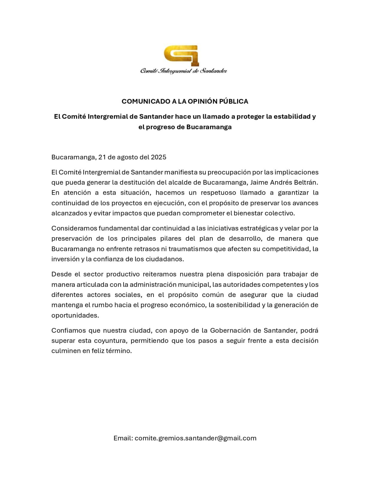 Gremios económicos de Santander en las últimas horas han manifestado su preocupación tras la destitución del alcalde de Bucaramanga, Jaime Andrés Beltrán, por doble militancia. Los diferentes comités dicen que se deben mantener los proyectos que se estaban desarrollando para no afectar el progreso de la ciudad.