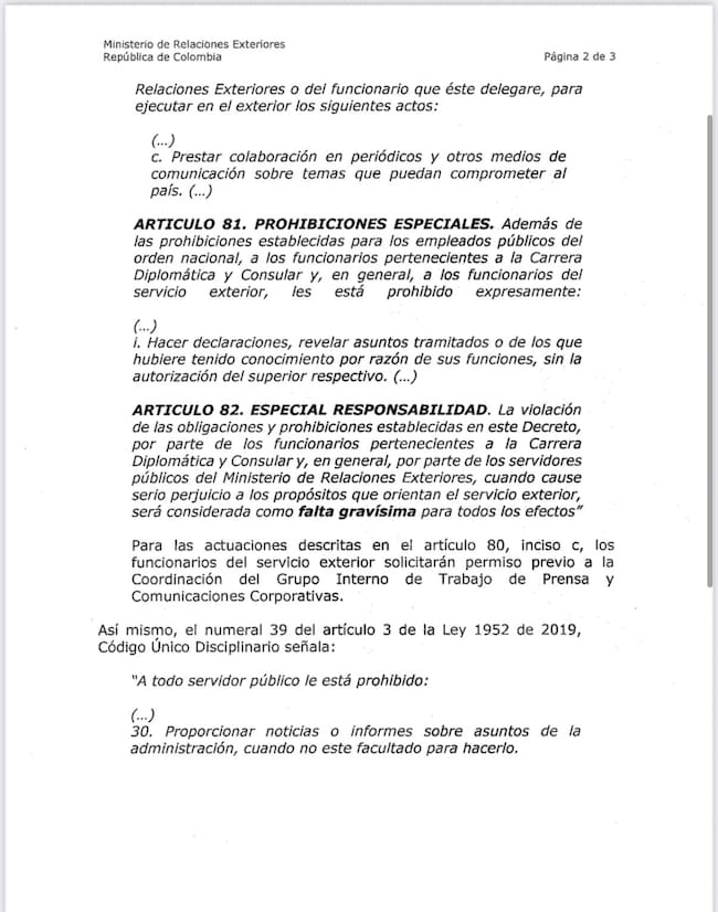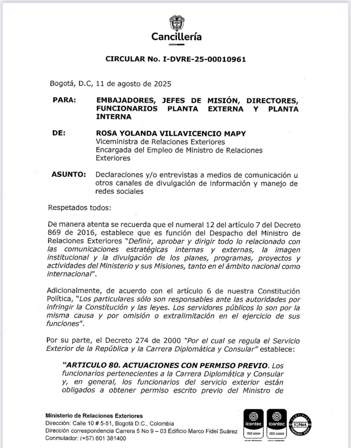 “Se recuerda a los servidores que toda declaración u opinión dada a los medios de comunicación deberá estar alineada con las políticas de Gobierno y bajo la supervisión del Despacho de la Canciller, a través del GIT de Prensa y Comunicación Corporativa”, dice el memorando.