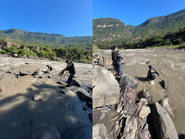Autoridades de socorro buscan a hombre que cayó de una tarabita en el río Chicamocha. Fotos: Gestión del riesgo de Santander.