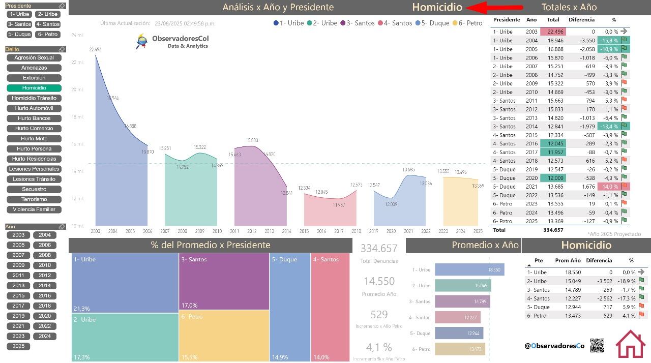 - El presidente Gustavo Petro arrancó su Gobierno en 2.023 con 13.555 y en lo que va este 2025, los primeros siete meses se tienen registros de 7.799, que proyectado a fin de año tendría un registro de 13.369 homicidios.