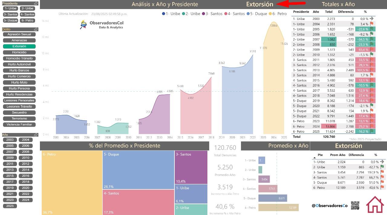 - El presidente Gustavo Petro arrancó su Gobierno en 2.023 con 11.078 y de acuerdo al registro de enero a julio, se proyecta que el año cierre en 11.624 extorsiones.