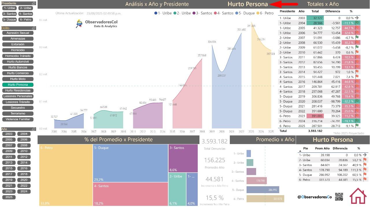 - El presidente Gustavo Petro arrancó su Gobierno en 2.023 con 391.005 y se proyecta que el cierre del año 2025, se tengan 287.501 denuncias por hurto.