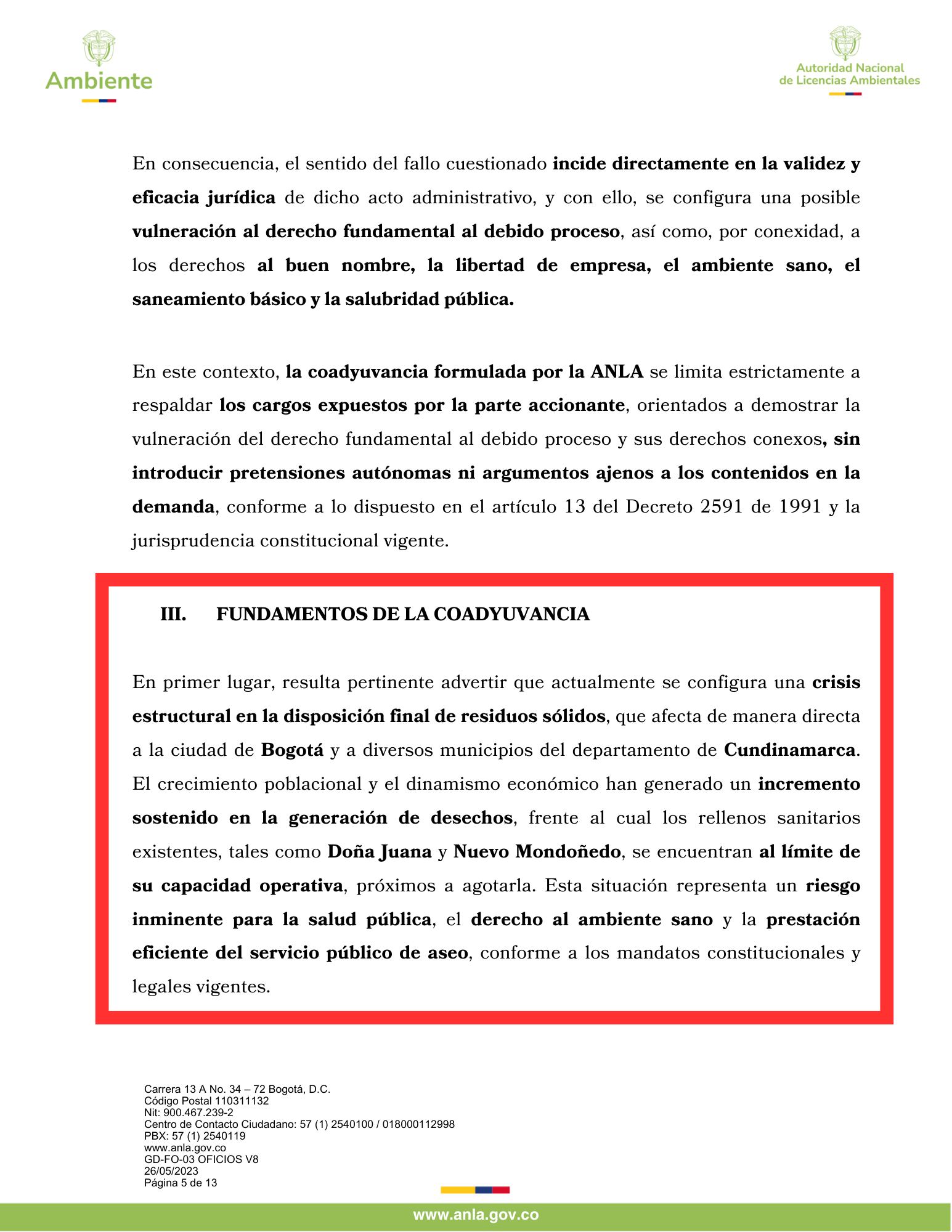 Explica que “los rellenos existentes, como Doña Juana y Nuevo Mondoñedo, se encuentran al límite de su capacidad operativa, próximos a agotarla.”