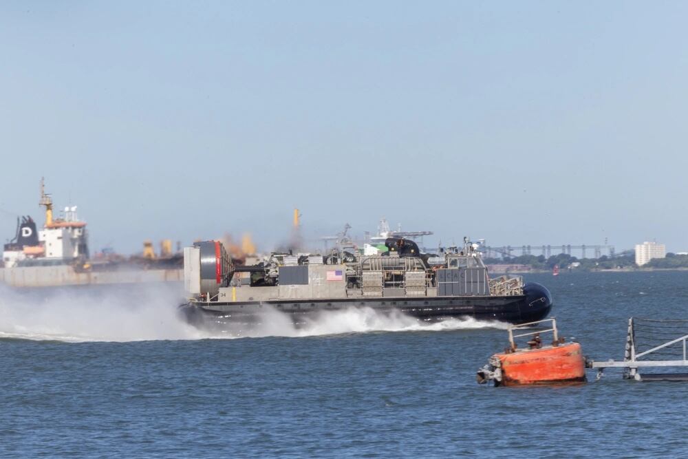 Un cojín de aire de la lancha de desembarco de la Armada de los EE. UU. transporta municiones de artillería de la 22.ª Unidad Expedicionaria de los Marines (con capacidad para operaciones especiales) al buque de transporte anfibio clase San Antonio USS Fort Lauderdale (LPD 28), Grupo Anfibio Listo Iwo Jima. Crédito: Departamento de Defensa de EE.UU.