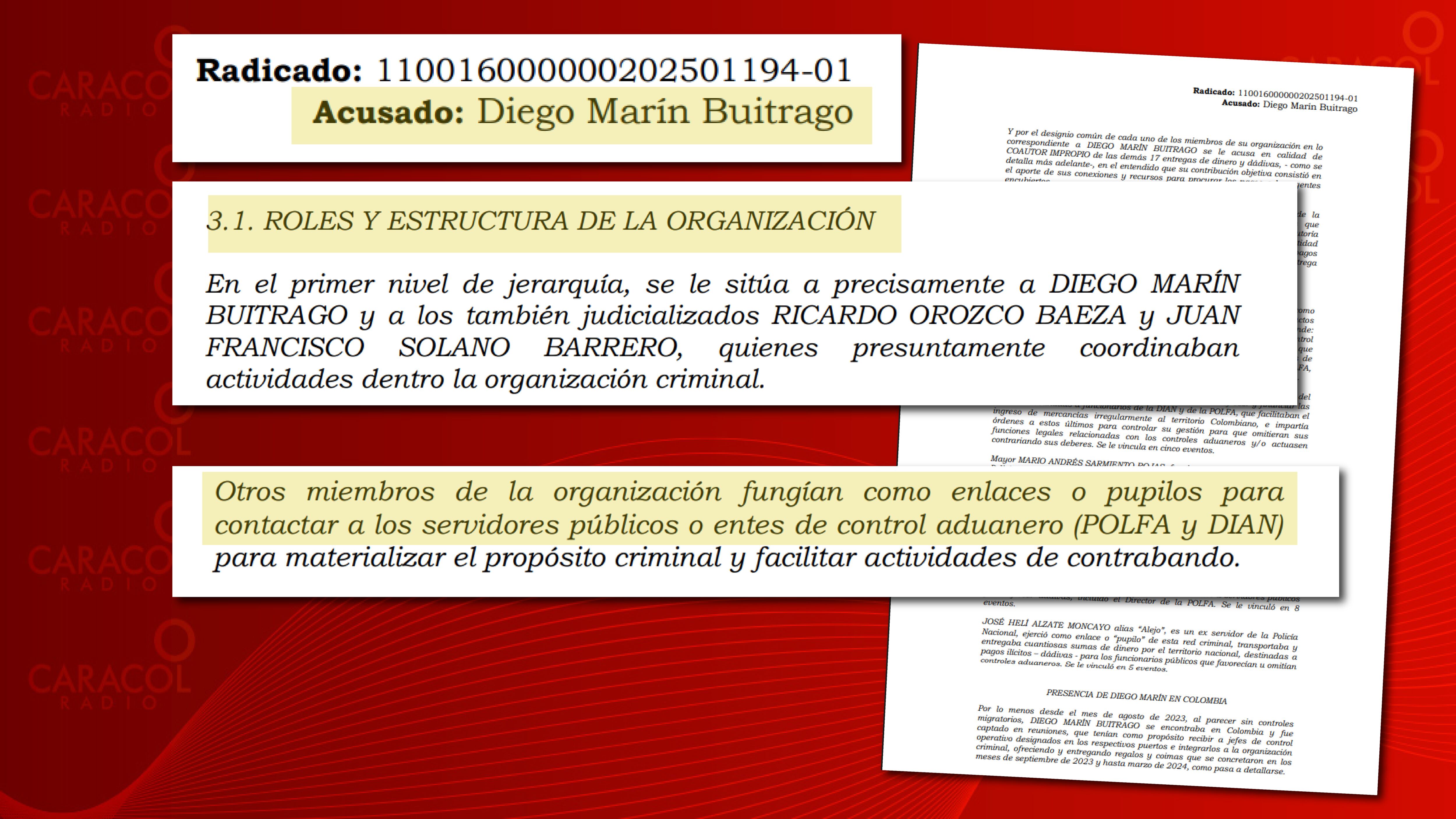 “Por lo menos desde el mes de agosto de 2023, al parecer sin controles migratorios, DIEGO MARÍN BUITRAGO se encontraba en Colombia y fue captado en reuniones, que tenían como propósito recibir a jefes de control operativo designados en los respectivos puertos e integrarlos a la organización criminal, ofreciendo y entregando regalos y coimas que se concretaron en los meses de septiembre de 2023 y hasta marzo de 2024”. Indica el expediente.