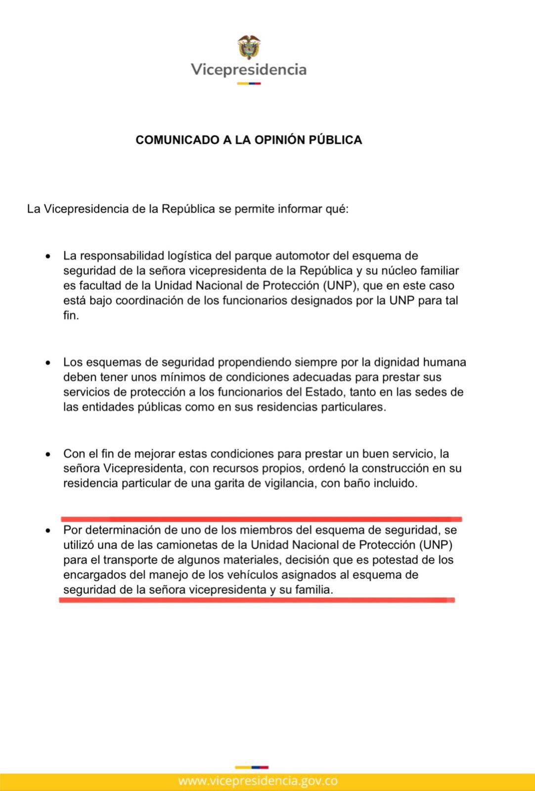 “Se están utilizando camionetas del esquema de seguridad para llevar materiales a la casa de la vicepresidenta. Es un uso indebido de recursos oficiales y debe investigarse”, escribió Briceño en sus redes sociales, donde pidió claridad a la UNP y a Márquez sobre los hechos.