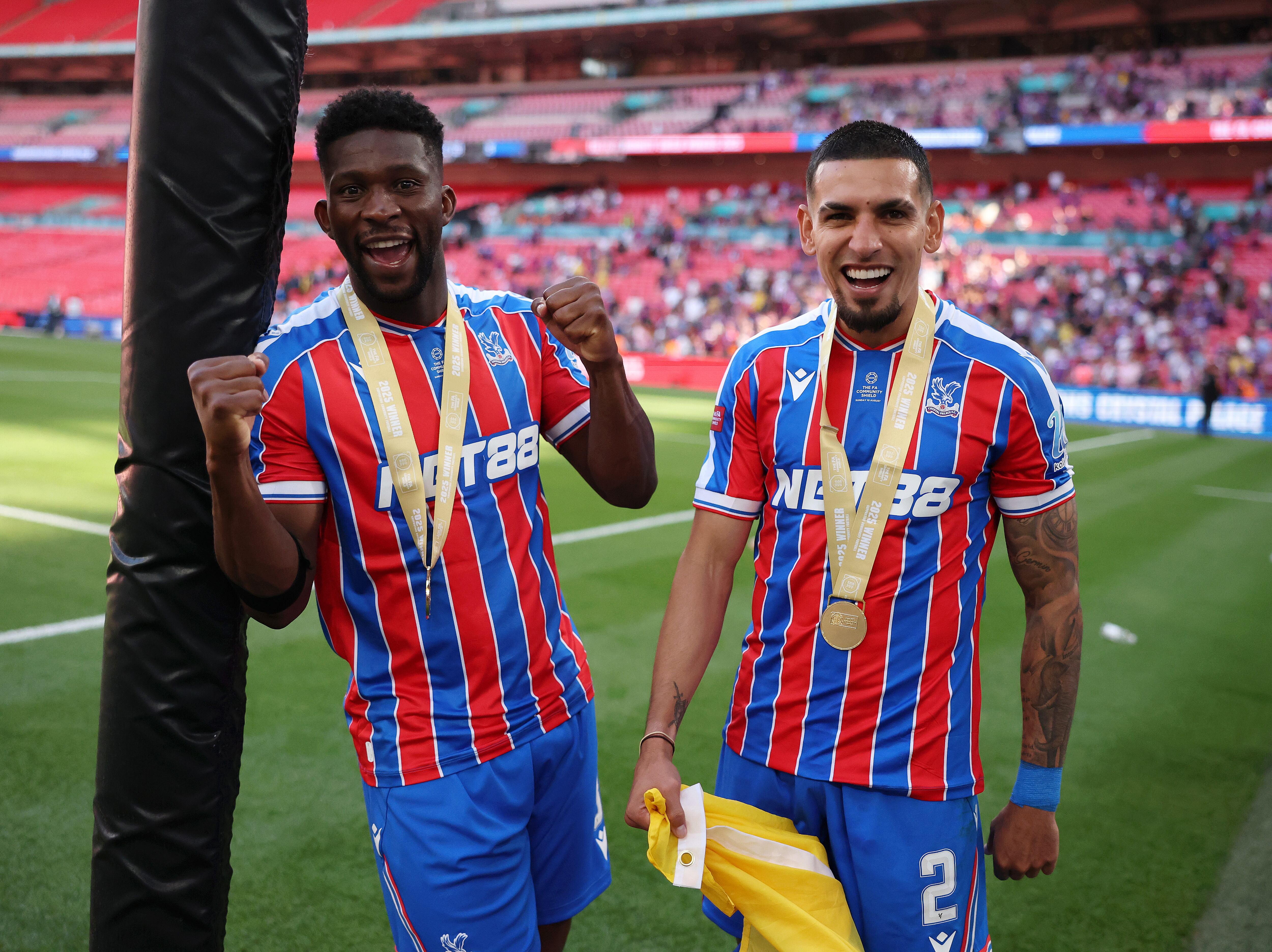 Jefferson Lerma y Daniel Muñoz tras conquistar la Community Shield. (Photo by Alex Pantling - The FA/The FA via Getty Images) / Alex Pantling - The FA