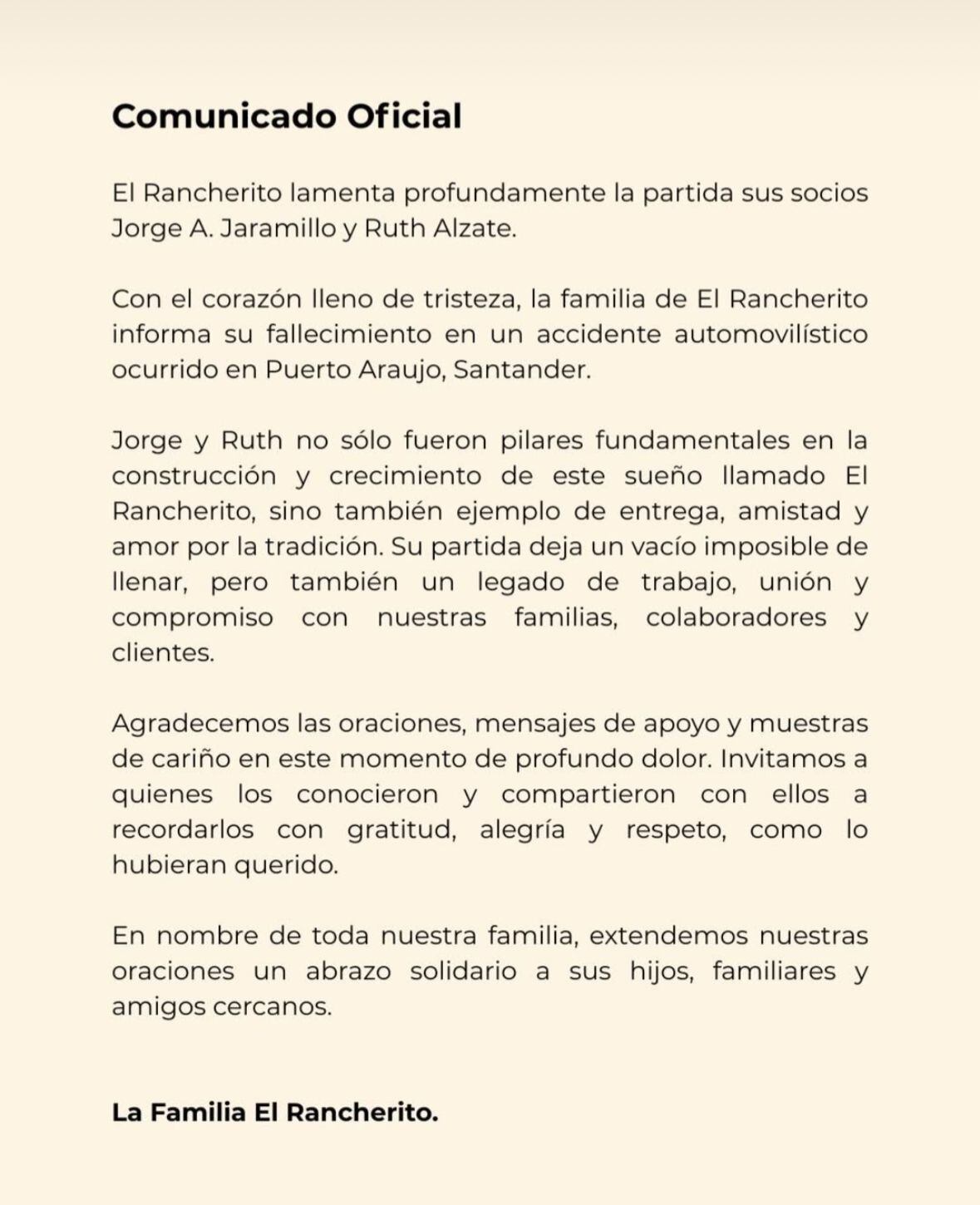 Jorge Alberto Jaramillo Restrepo y su esposa, Ruth Elena Alzate, fundadores del restaurante antioqueño El Rancherito, que lleva más de 50 años desde su creación, perdieron la vida en las últimas horas en un accidente de tránsito en la vía que comunica a Bucaramanga con Puerto Berrío.