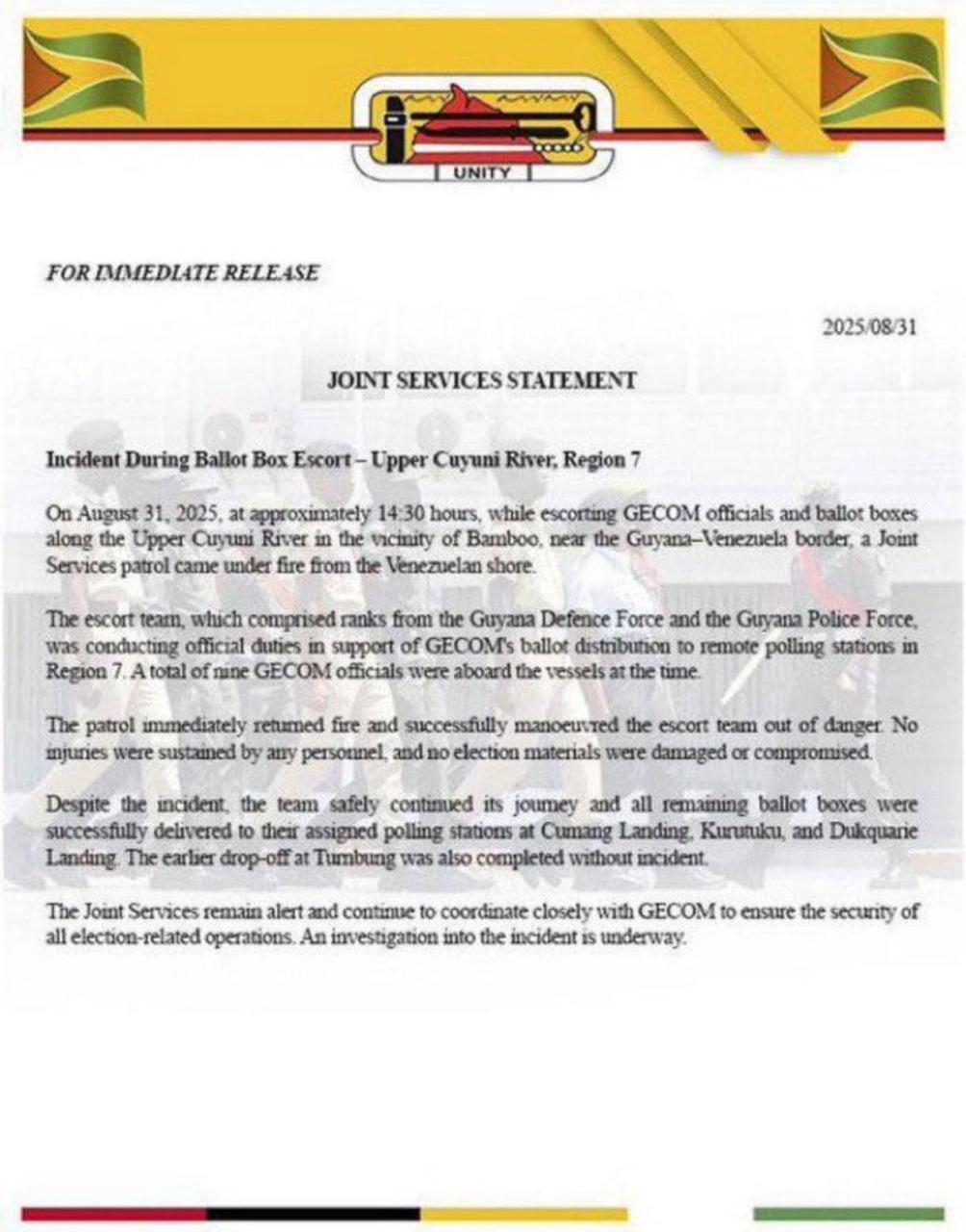 La lancha patrulla, que transportaba personal militar y policial, escoltaba a funcionarios electorales de Guyana que distribuían material electoral en sedes remotas cuando fue atacada desde la costa venezolana.