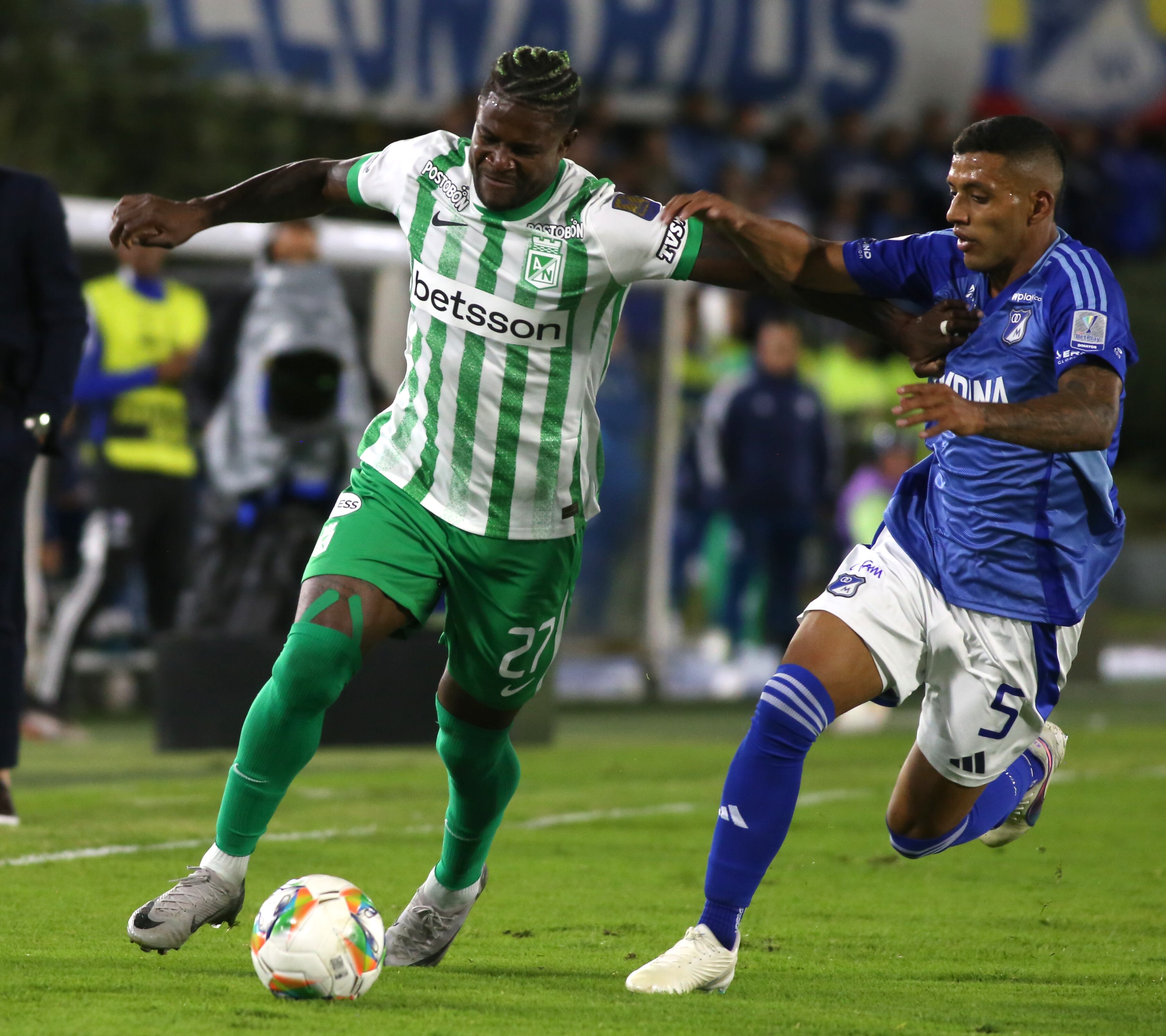 Dairon Asprilla de Atlético Nacional y Nicolás Arévalo de Millonarios F.C. FOTO: Daniel Garzon Herazo/NurPhoto via Getty Images / NurPhoto