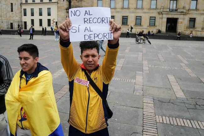 En la Plaza de Bolívar, frente al Congreso de la República, dirigentes del Comité Olímpico y Paralímpico Colombiano, junto a deportistas y medallistas nacionales, realizaron un plantón para expresar su preocupación por la reducción del presupuesto destinado al deporte en el país. (Colprensa - Catalina Olaya)