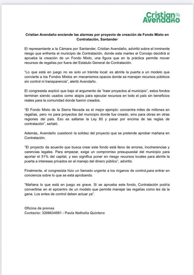 “Lo que está en juego es grave. Si se aprueba este fondo, Contratación podría convertirse en el epicentro de un modelo que permite manejar las regalías como se quiera, sin control ni transparencia”, advirtió Avendaño.