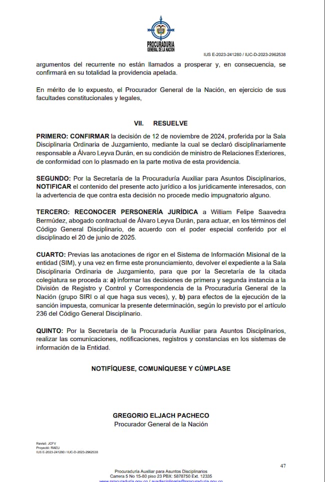En un fallo de segunda instancia, la Procuraduría ratificó la sanción de destitución e inhabilidad por 10 años al excanciller Álvaro Leyva Durán por las irregularidades en la licitación de los pasaportes.