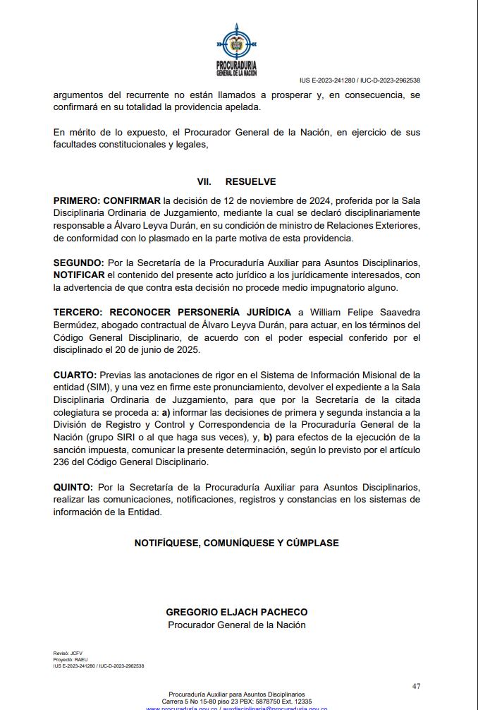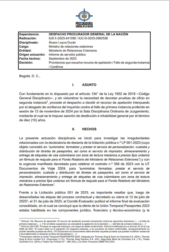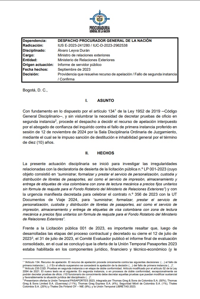 En un fallo de segunda instancia, la Procuraduría ratificó la sanción de destitución e inhabilidad por 10 años al excanciller Álvaro Leyva Durán por las irregularidades en la licitación de los pasaportes.