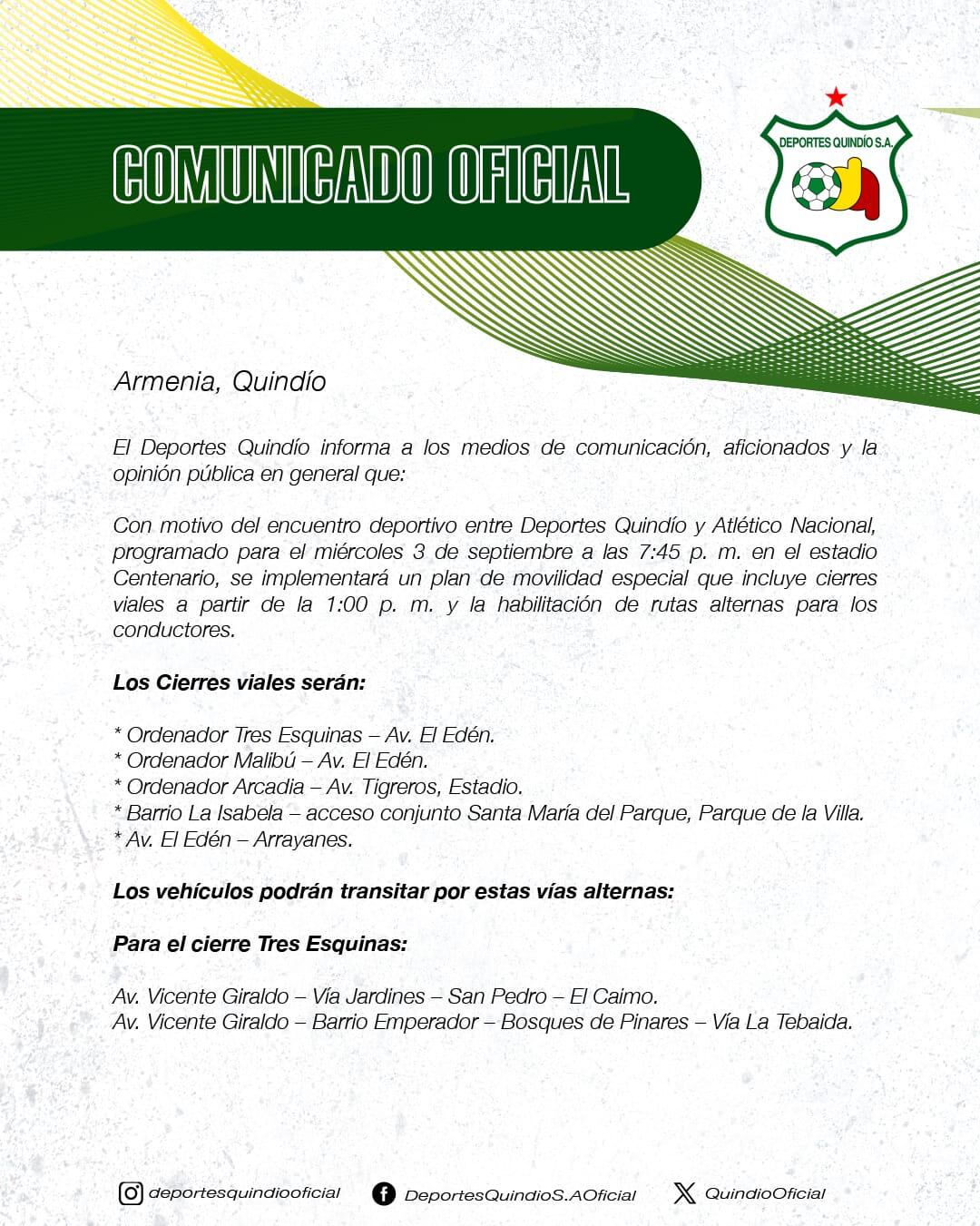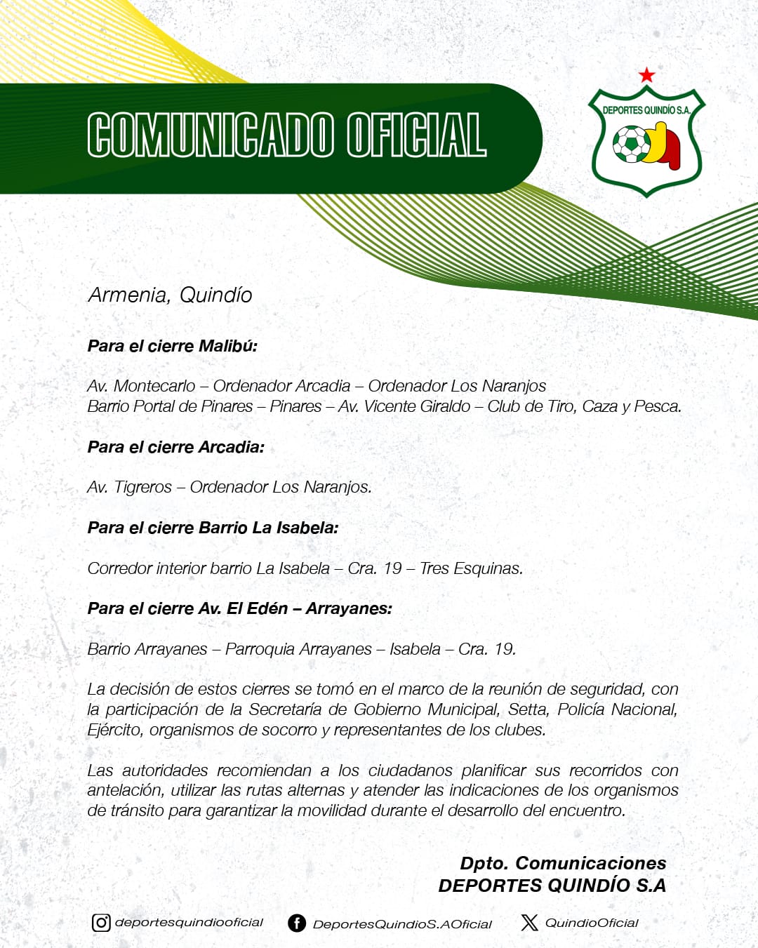 Desde el Deportes Quindío emitieron un comunicado dando a conocer los cierres viales: