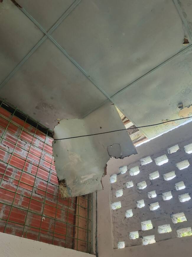 La escuela tiene paredes debilitadas, puertas caídas, fallas eléctricas, el cielo raso colapsado, el techo lleno de agujeros y cada vez que llueve, las clases deben interrumpirse por filtraciones y goteras.