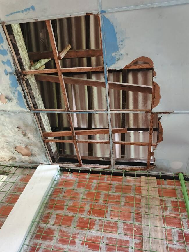 La escuela rural El Caimán de la Institución Educativa Galápagos, ubicada en el municipio de Rionegro, Santander, se encuentra a punto de colapsar, por lo que la comunidad educativa denuncia el preocupante estado. Paredes debilitadas, puertas caídas, fallas eléctricas, el cielo raso colapsado, el techo lleno de agujeros y cada vez que llueve, las clases deben interrumpirse por filtraciones y goteras que inundan el salón principal y los pasillos.