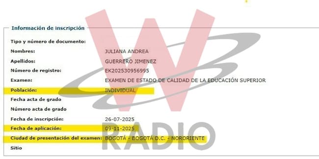 Fuentes compartieron a W Radio el registro con el que se evidencia que Juliana Guerrero, postulada para ser viceministra de Juventud, presentará hasta el próximo 9 de noviembre de este año las pruebas Saber Pro, requisito para graduarse como profesional en Colombia.