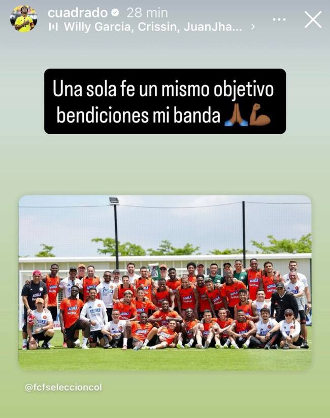 Con la frase “Una sola fe, un mismo objetivo, bendiciones, mi banda” Cuadrado, reposteo una foto que subió la cuenta oficial de la Selección Colombia a Instagram, donde está todo el plantel en entrenamientos previo al duelo con los bolivianos.