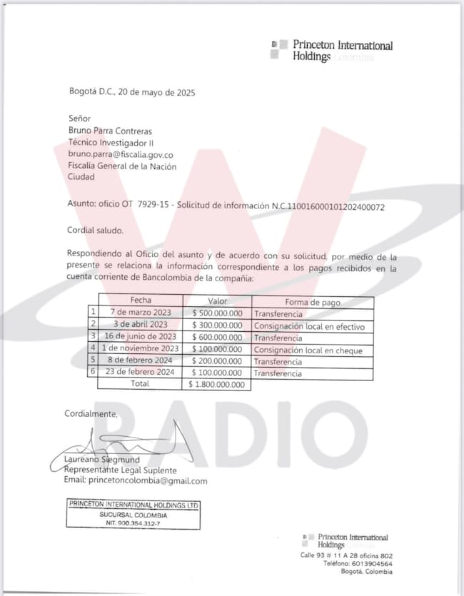 El documento que da constancia de esos hechos está en poder de la Fiscalía General de la Nación. Es una carta dirigida por el representante legal suplente de Princeton International, la empresa de Serafino Iacono, al investigador del CTI, Bruno Parra. En la carta se relacionan 6 pagos efectuados con depósitos a una cuenta de Bancolombia.