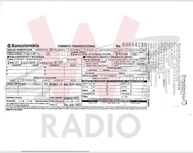 El cuarto pago fue por 100 millones de pesos y fue efectuado el 1 de noviembre de 2023, con cheque depositado en sucursal de Bancolombia La Carolina-Unicentro, por un hombre llamado Darío Enrique Guarnizo Ramírez.