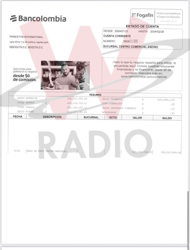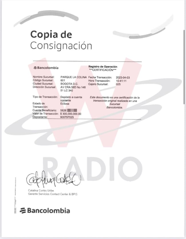 La Fiscalía tiene constancia de que alguien, hasta ahora no identificado, llegó con 300 millones de pesos en billetes a la sucursal de Bancolombia en el Centro Comercial Parque La Colina de Bogotá y los depositó en la cuenta de la empresa de Iacono.