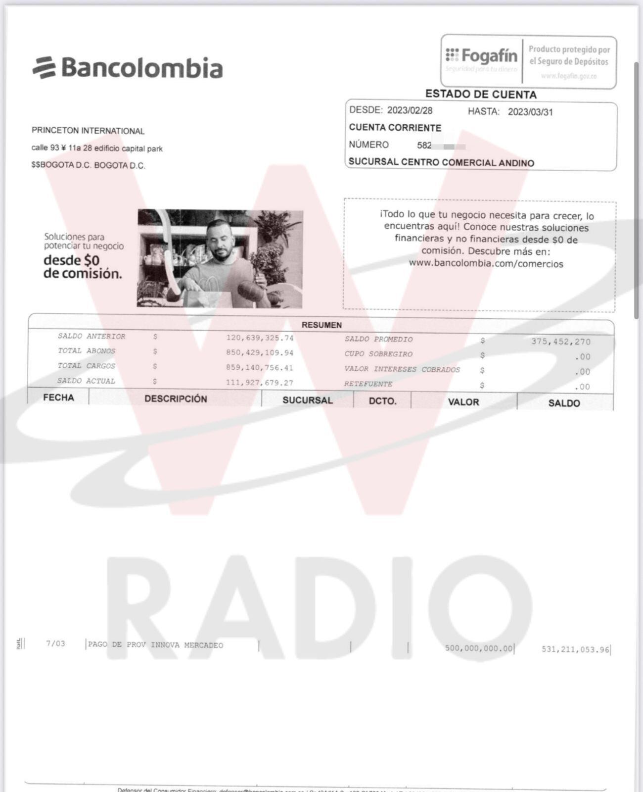 La Fiscalía tiene constancia de que alguien, hasta ahora no identificado, llegó con 300 millones de pesos en billetes a la sucursal de Bancolombia en el Centro Comercial Parque La Colina de Bogotá y los depositó en la cuenta de la empresa de Iacono.
