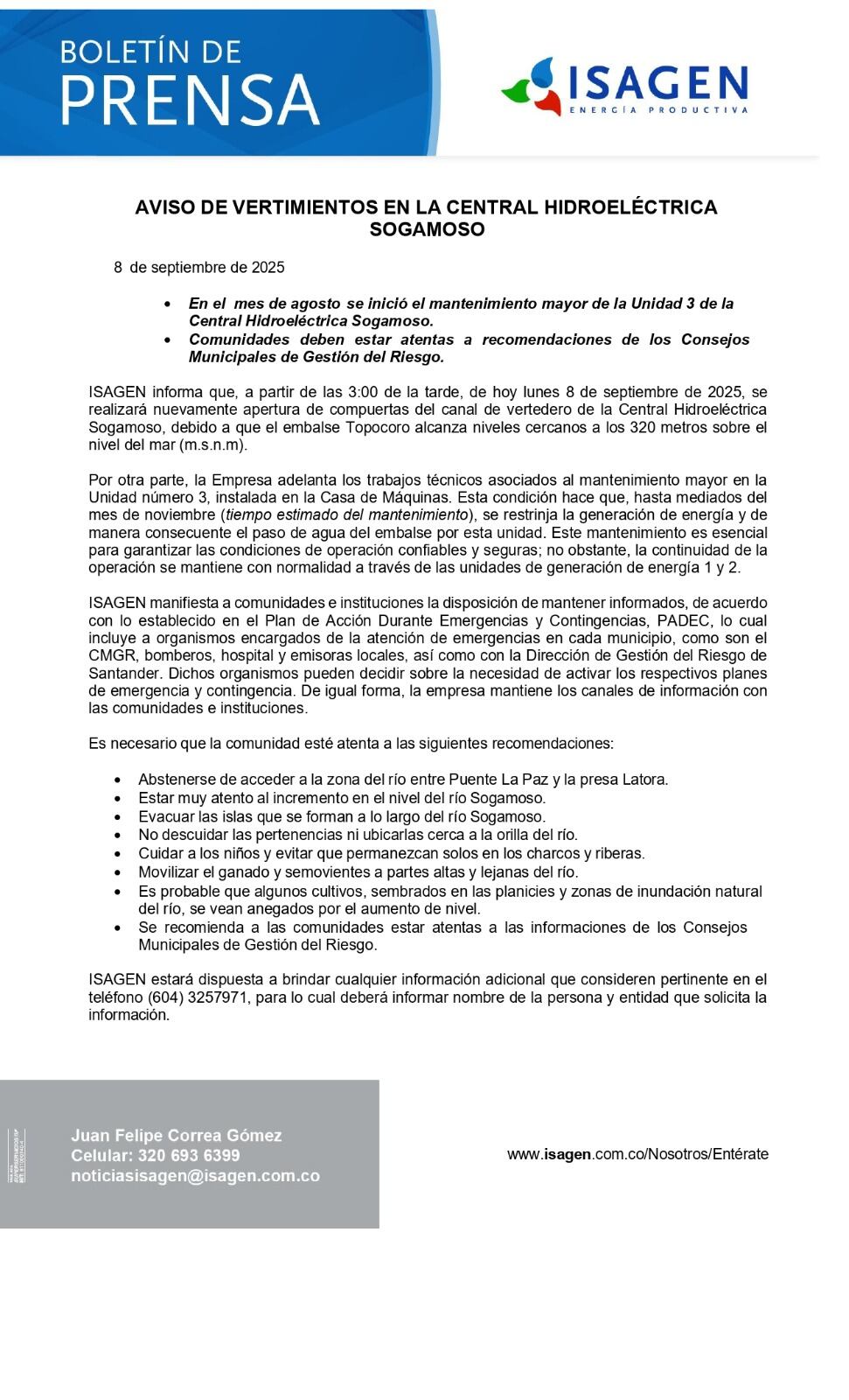 Debido a que el embalse Topocoro alcanza niveles cercanos a los 320 metros sobre el nivel del mar, se dio apertura de las compuertas del canal del vertedero de la Central Hidroeléctrica Sogamoso, según ISAGEN, empresa colombiana de generación y comercialización de energía.