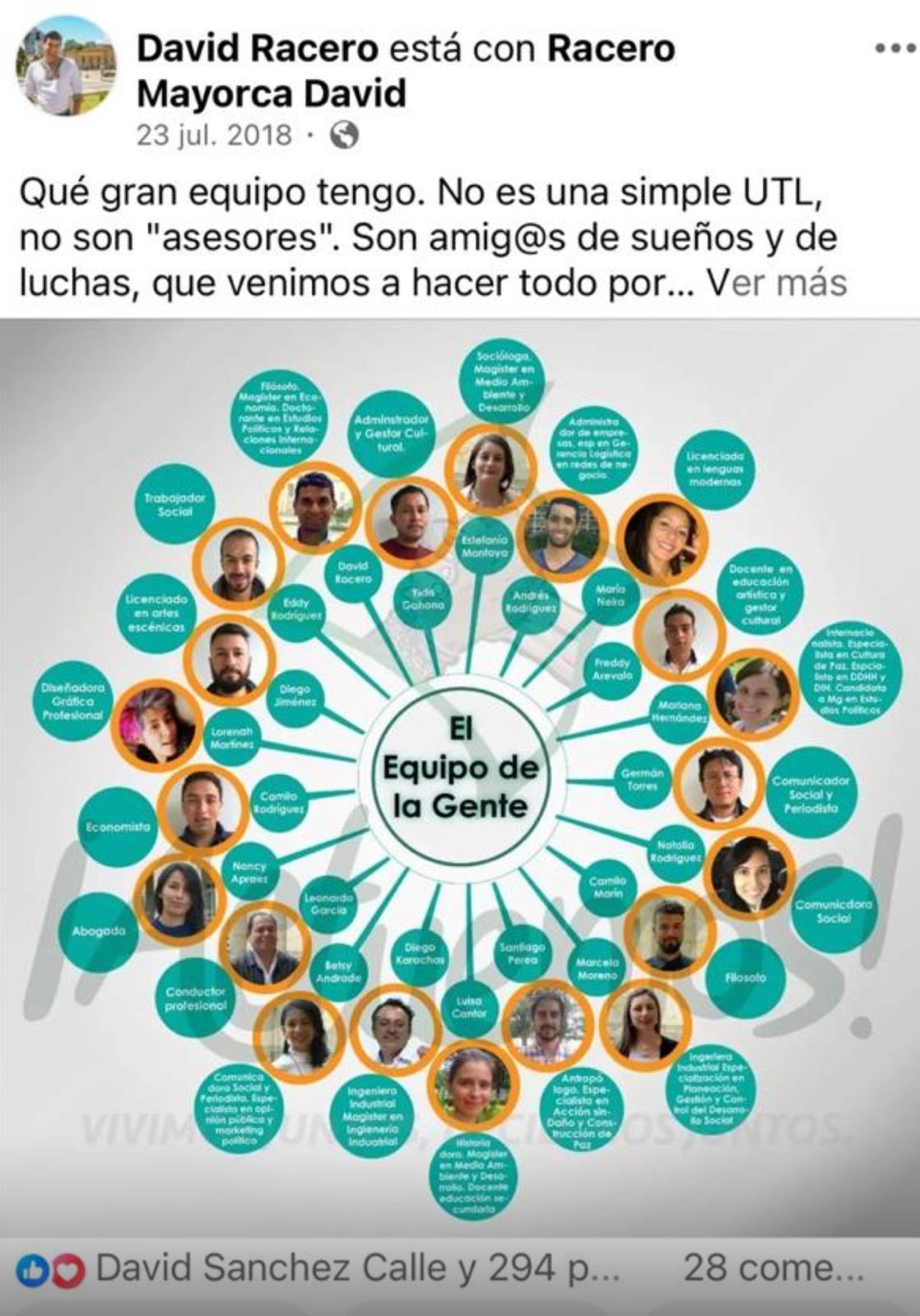 Resulta aún más revelador que el propio representante a la Cámara, David Racero, en su cuenta de Instagram, el 23 de julio de 2018, presente las fotos de los miembros de su Unidad de Trabajo Legislativo, en estos términos: “Qué gran equipo tengo. No son una simple UTL, no son “asesores”. Son amigos de sueños y de luchas”. Al lado de la foto de Leonardo García aparecer el cargo: Conductor profesional. Como para que lo siga negando.