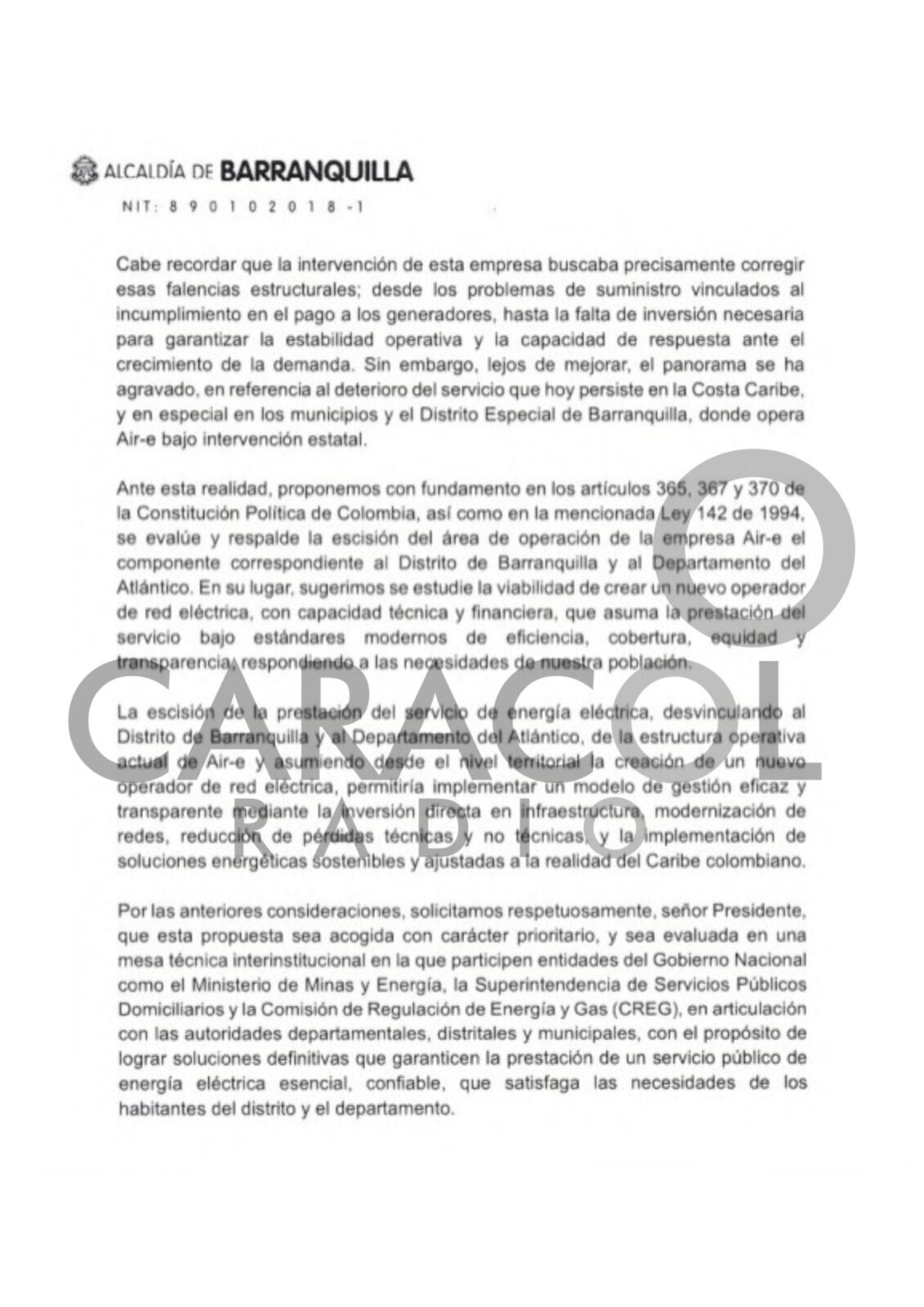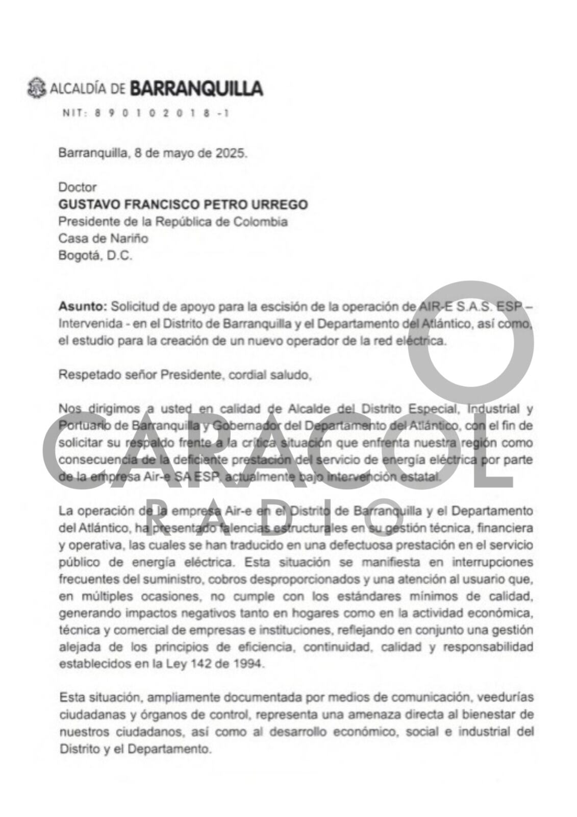 En una carta enviada al presidente Gustavo Petro, el pasado ocho de mayo, conocida por Caracol Radio y firmada por el alcalde Alex Char y el Gobernador del Atlántico, Eduardo Verano, los mandatarios locales proponen la escisión de la operación de Air-e Intervenida en Barranquilla y el departamento y que se estudie la creación de un nuevo operador de la red eléctrica.