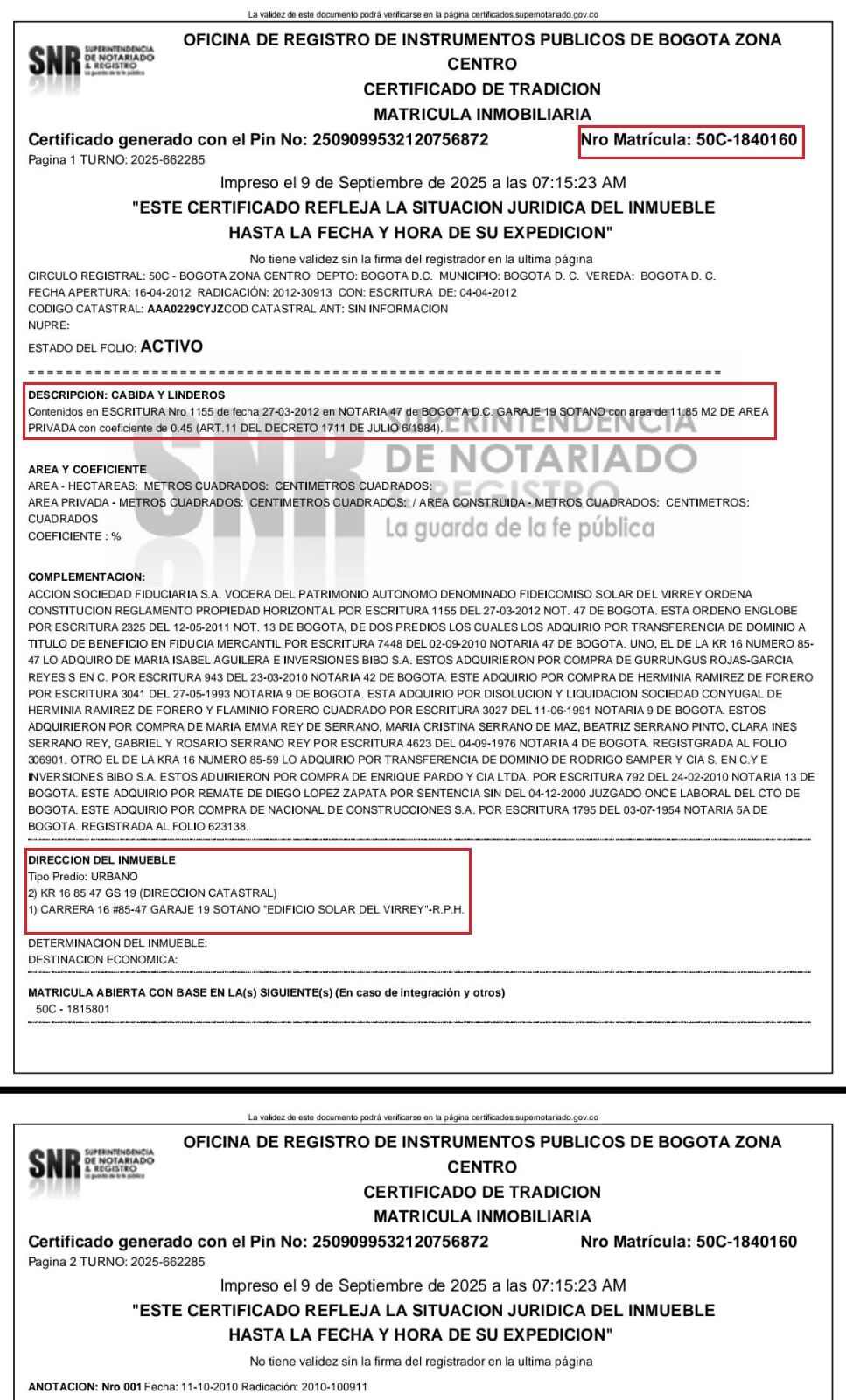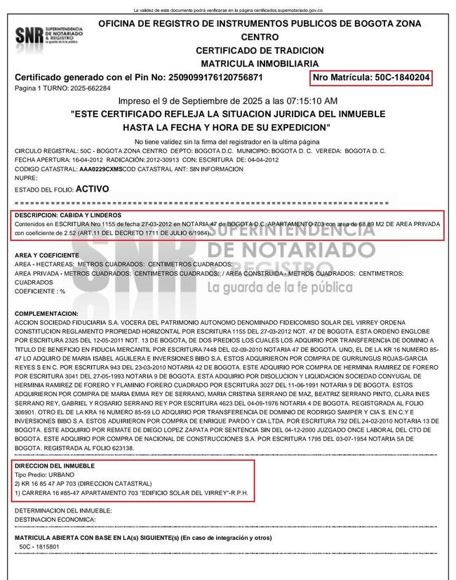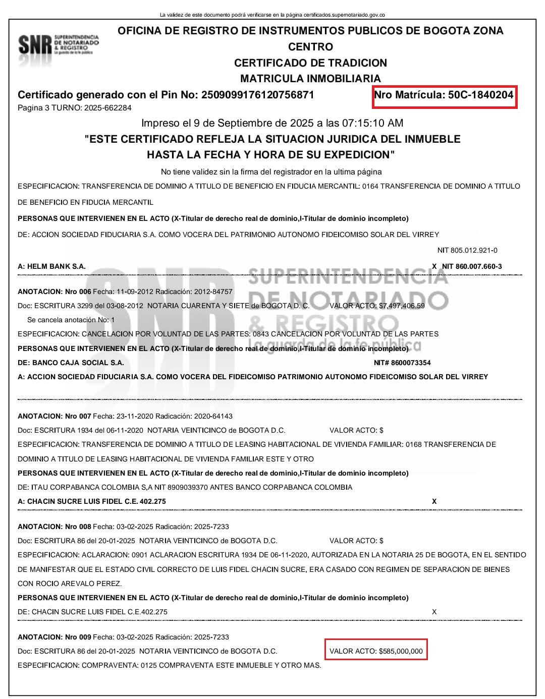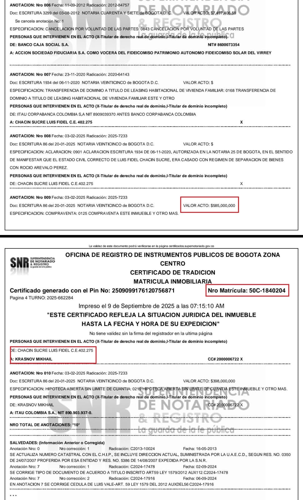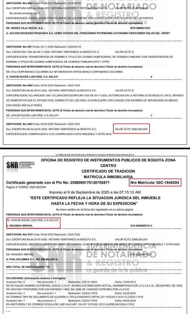 El predio era propiedad de Luis Fidel Chacín Sucre, identificado con cédula de extranjería No. 402.275 por la suma de $585.000.000.