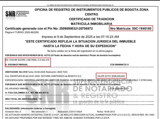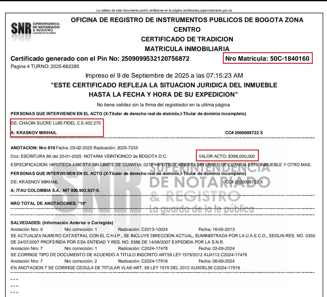 Ese mismo día en esa misma notaría se hace la hipoteca abierta sin límite de cuantía entre Mikhail Krasnov y el Banco Itau Colombia S.A., NIT:890.903.937-0 por $398.000.000.