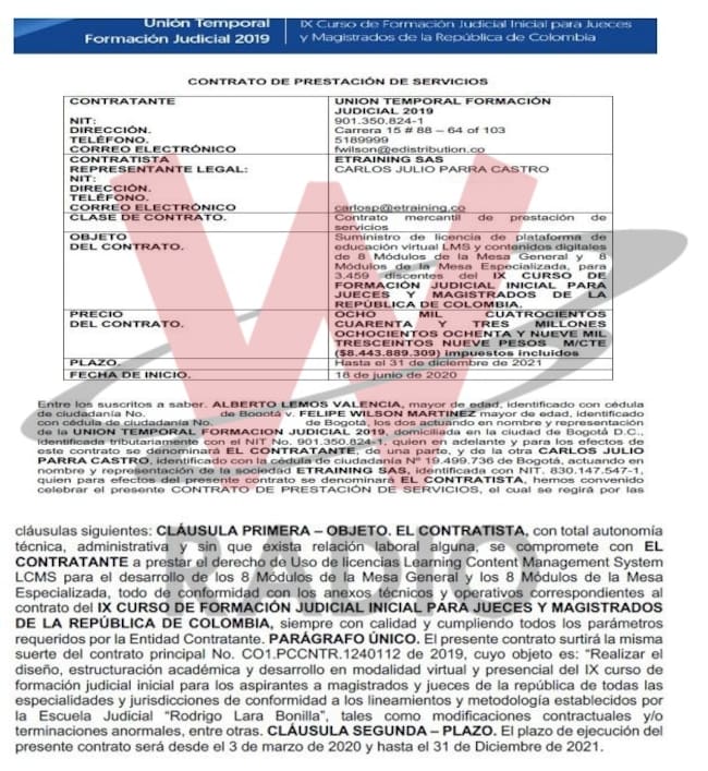 El 20 de diciembre de 2019 se firmó un multimillonario contrato entre el Consejo Superior de la Judicatura y la Unión Temporal Formación Judicial 2019 para que esta última diseñara, estructurara y desarrollara el curso-concurso para los aspirantes a ocupar las vacantes de jueces y magistrados de todas las especialidades a lo largo y ancho del país.