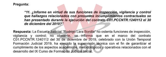 Empero, desde el Consejo Superior de la Judicatura, a través de su escuela judicial, respondió en el pasado mes de abril que en su labor de seguimiento al contrato que ejecuta la unión temporal Formación Judicial 2019 se ha garantizado el cumplimiento del mismo.